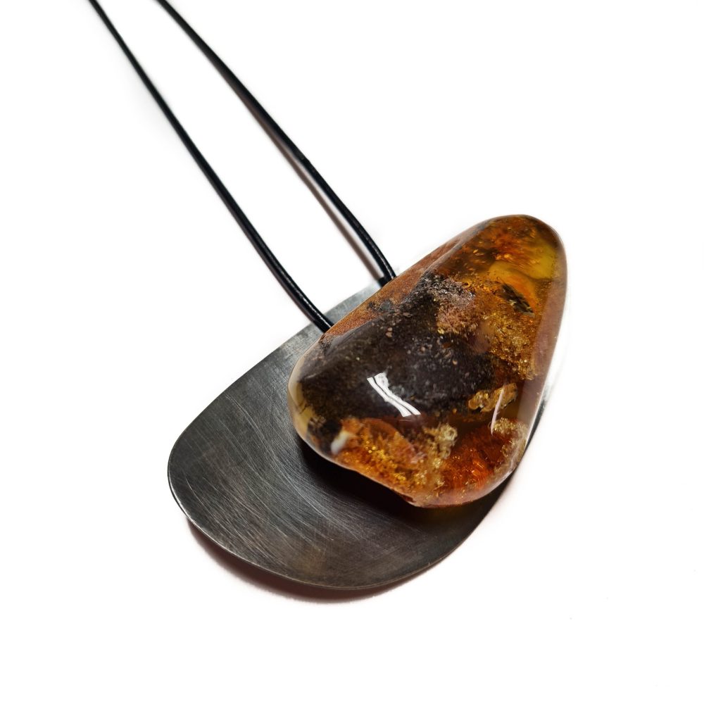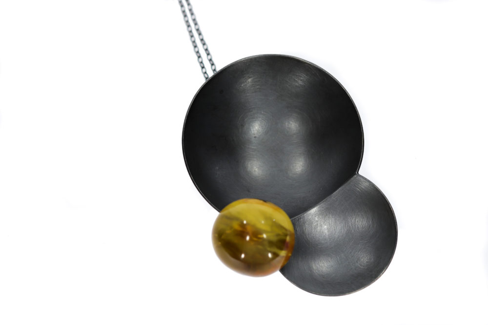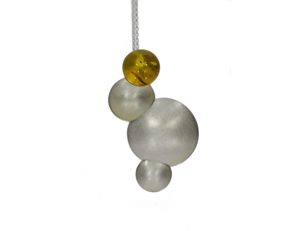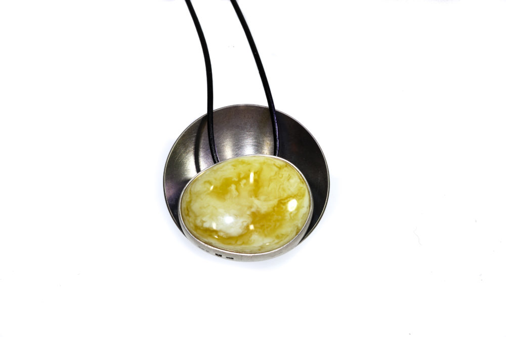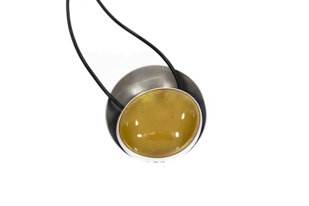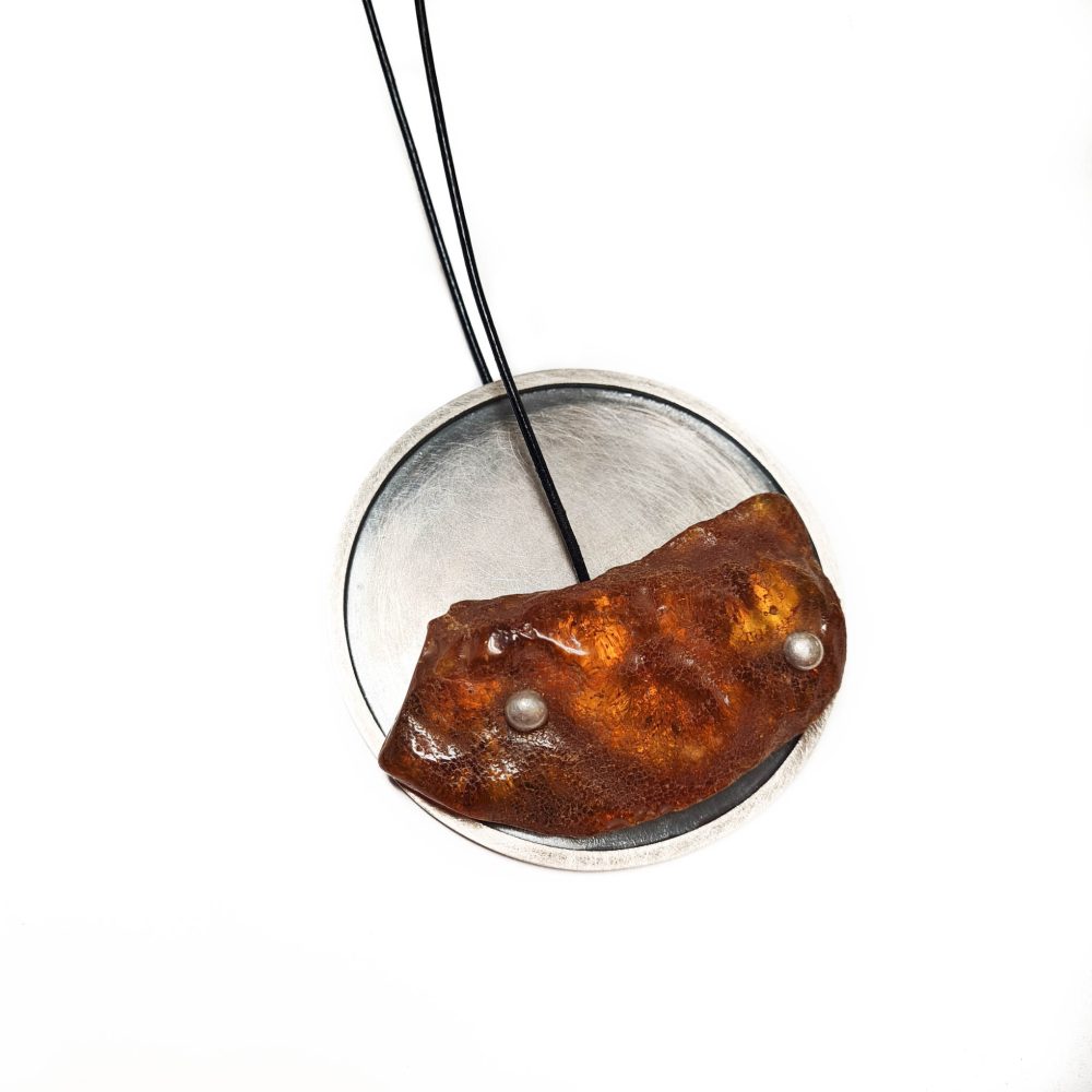 Dwie formy: wklęsłe koło ze srebra i naturalnie zaokrąglony bursztyn w gładkiej oprawie prowadzą ze sobą dialog, pozwalając lepiej wybrzmieć obu. Jedna umieszczona jest na drugiej, stykają się ze sobą na krawędzi, a dodatkowo (ale niewidocznie) łączą się pośrodku – jest to jednocześnie miejsce zawieszenia. Niebanalny uchwyt sprawia, że szczególnie zawieszony na krótkiej lince wisior zaskakuje. Uzupełnić go można pasującą bransoletą.