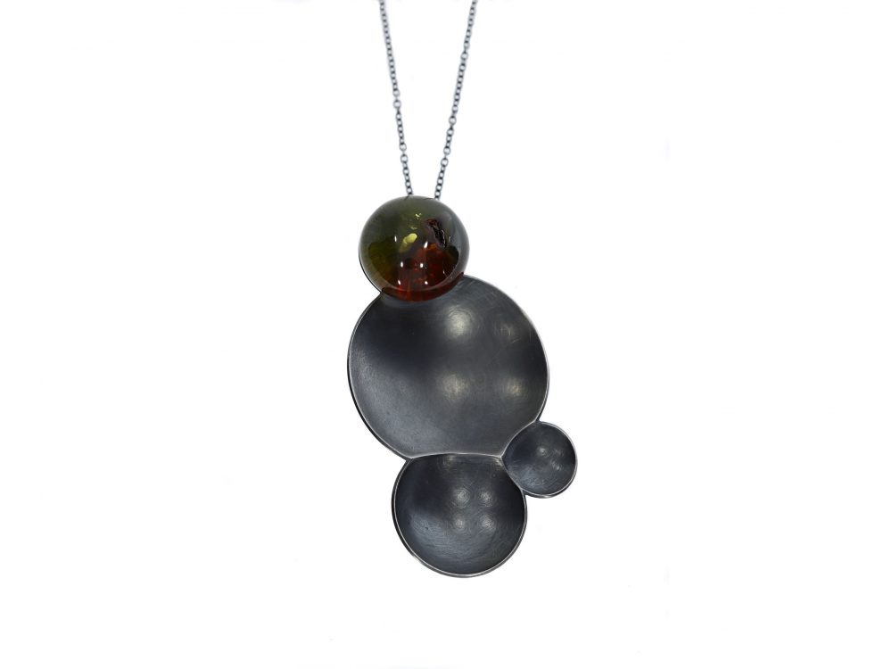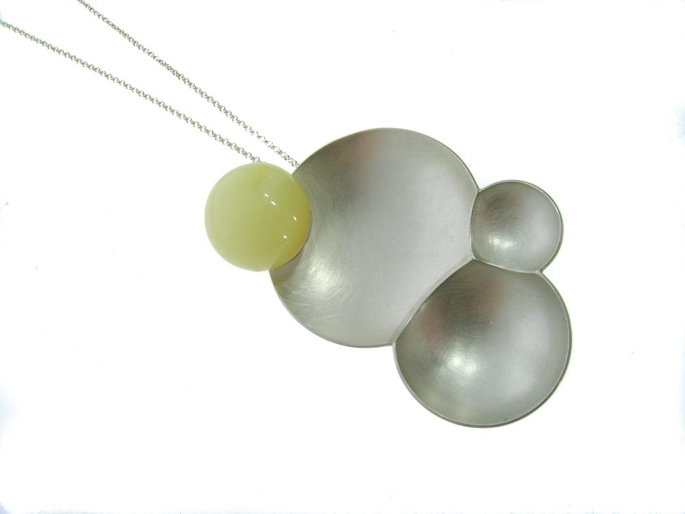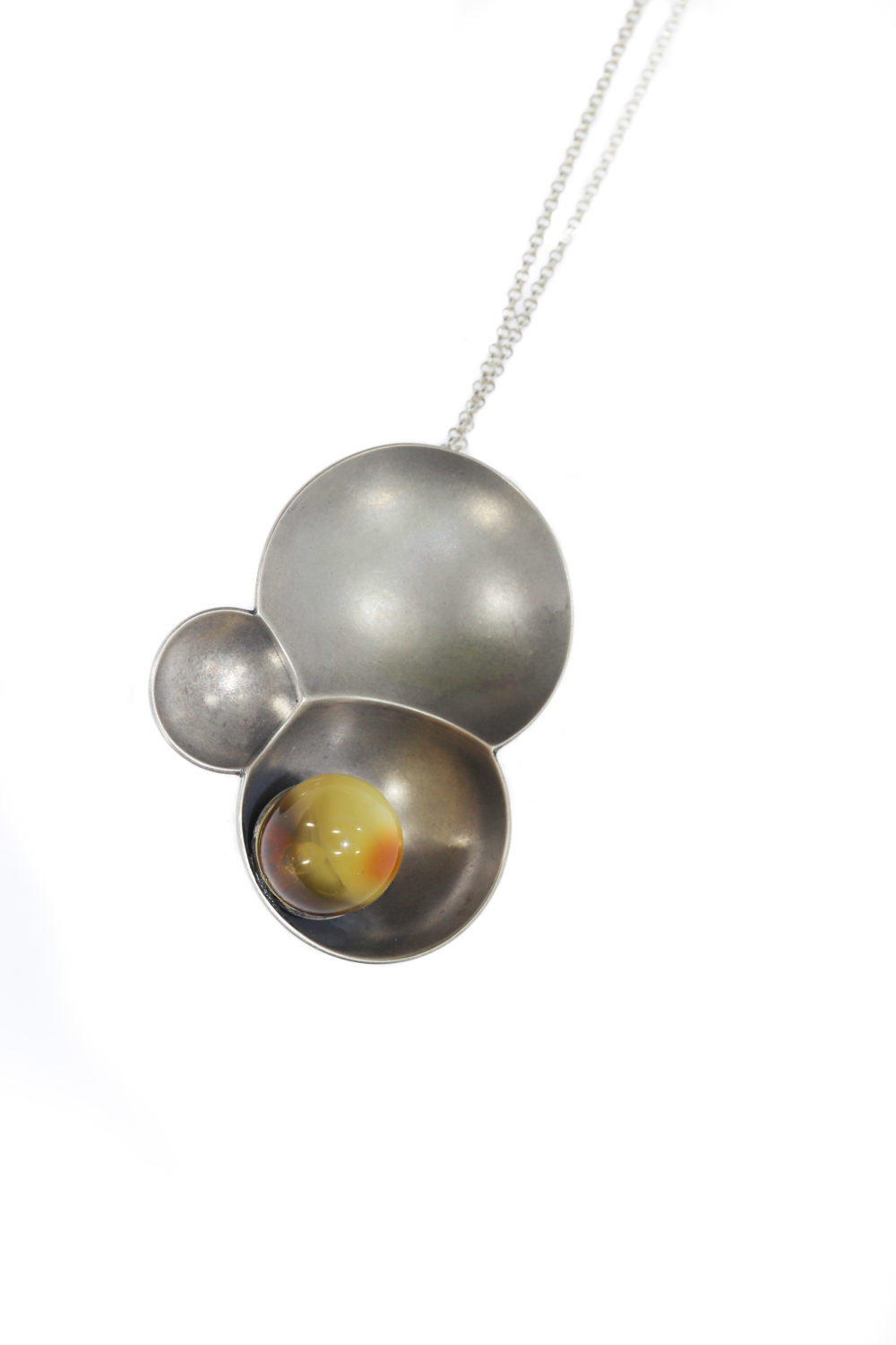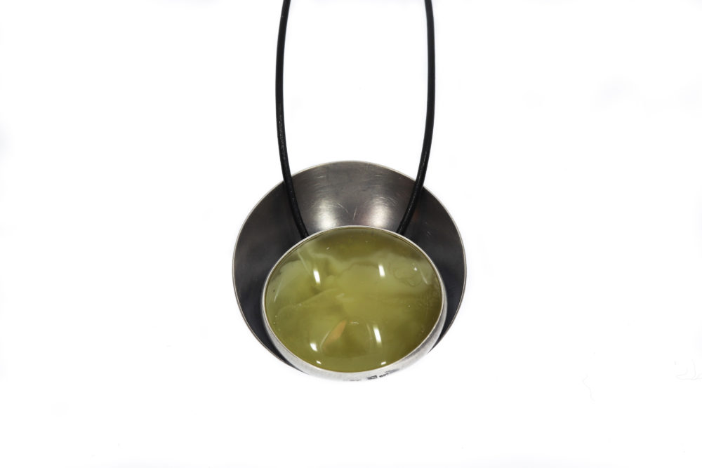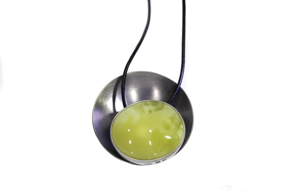 Dwie formy: wklęsłe koło ze srebra i naturalnie zaokrąglony bursztyn w gładkiej oprawie prowadzą ze sobą dialog, pozwalając lepiej wybrzmieć obu. Jedna umieszczona jest na drugiej, stykają się ze sobą na krawędzi, a dodatkowo (ale niewidocznie) łączą się pośrodku – jest to jednocześnie miejsce zawieszenia. Niebanalny uchwyt sprawia, że szczególnie zawieszony na krótkiej lince wisior zaskakuje. Uzupełnić go można pasującą bransoletą.