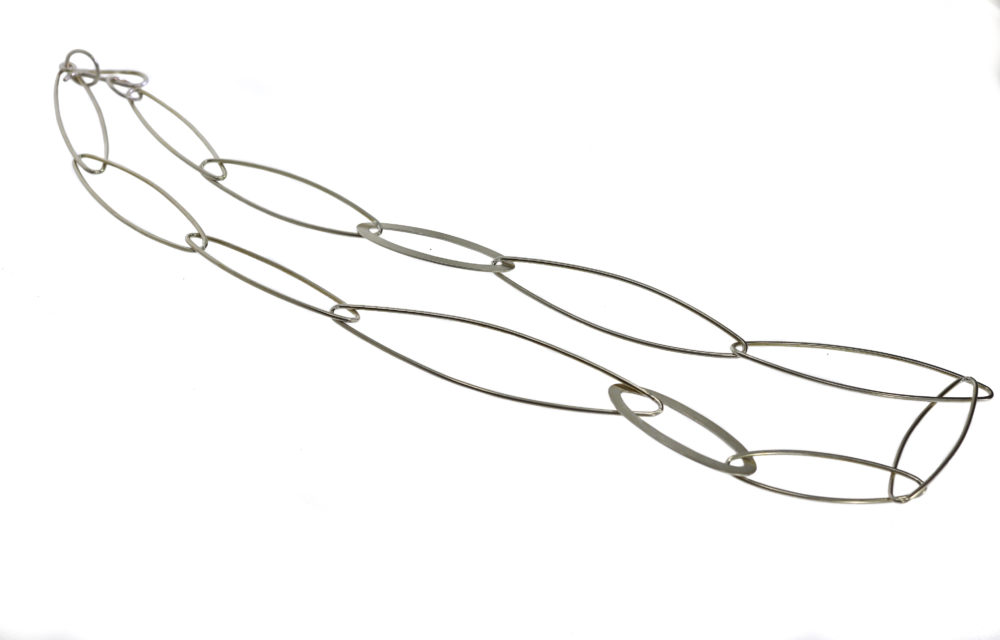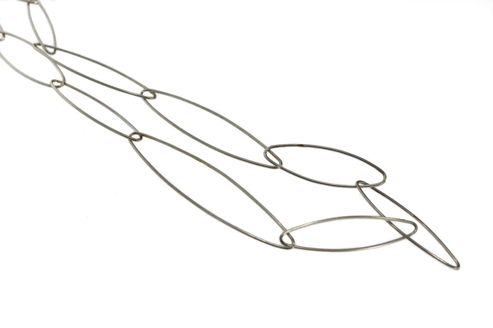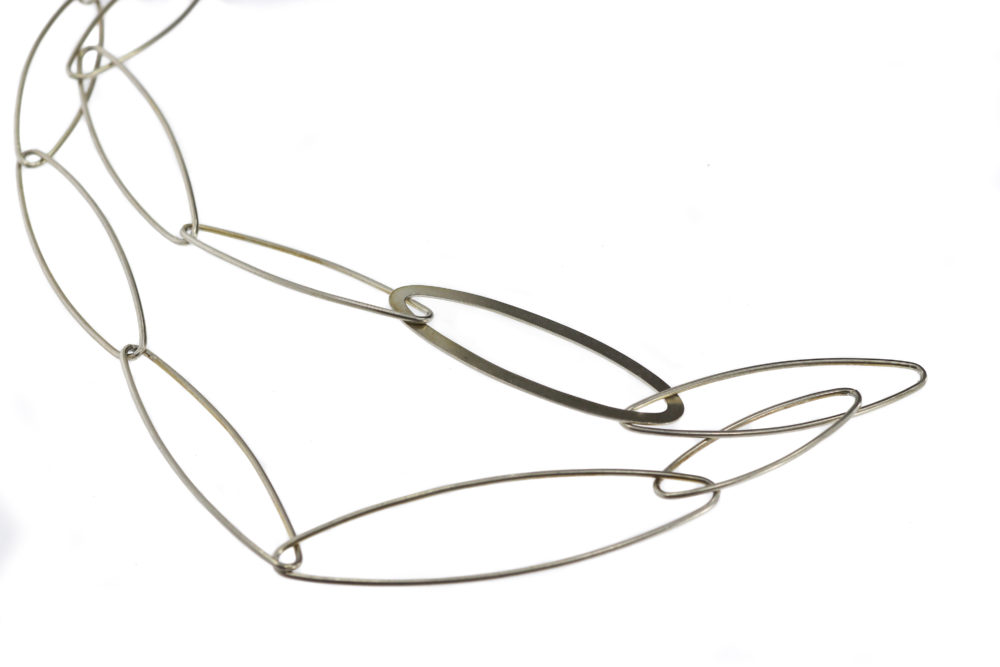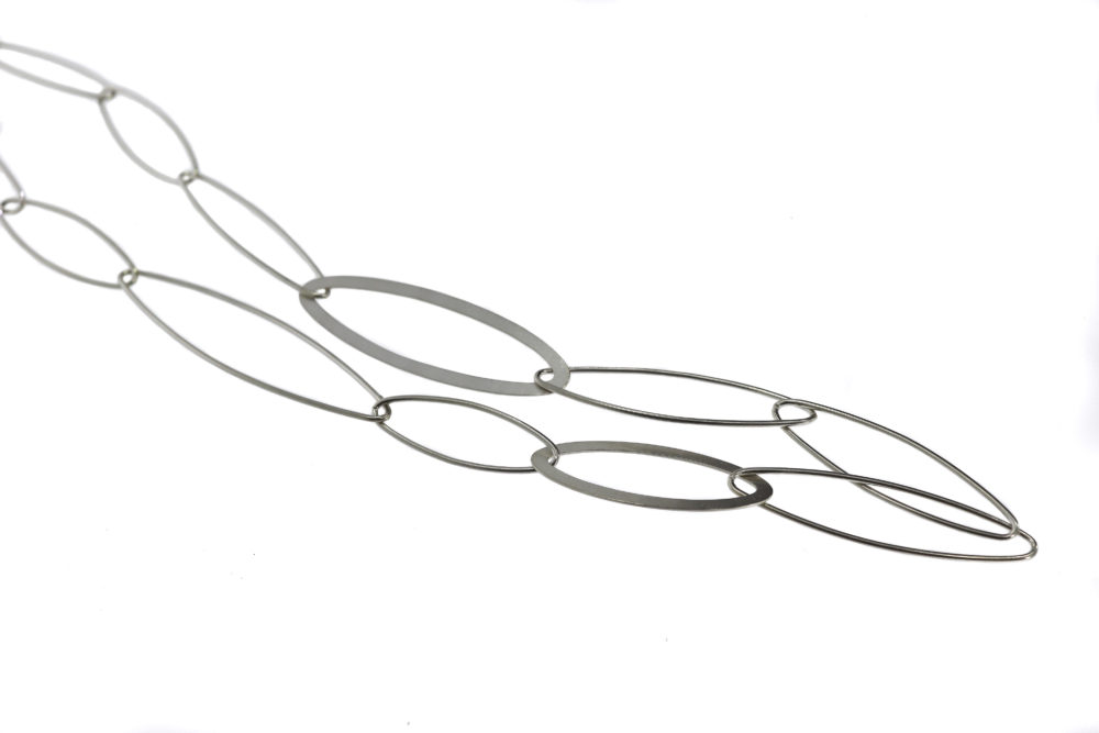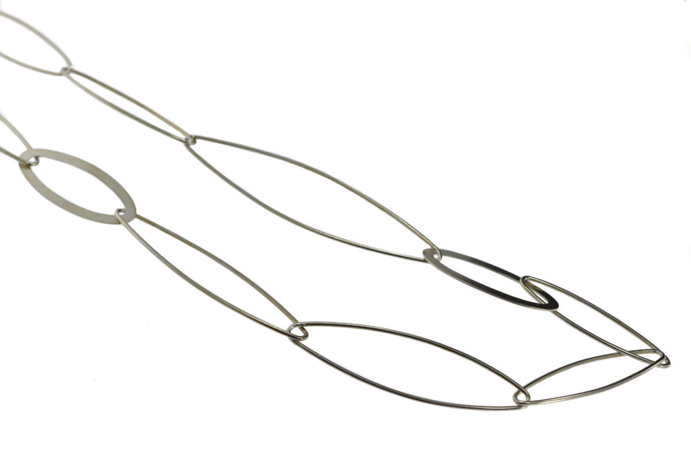 Ogniwa tych lekkich wizualnie naszyjników wykonane są z drutu lub wycięte z blachy, mają też każde inny rozmiar i ułożone są asymetrycznie. Rezultatem jest piękny graficzny rysunek, szczególnie gdy wyeksponowane są na jednolitym ciemnym tle. Wyglądają wspaniale noszone solo, ale zaprojektowane zostały też do nich specjalne wisiory z naturalnego bursztynu o fantazyjnych kształtach.