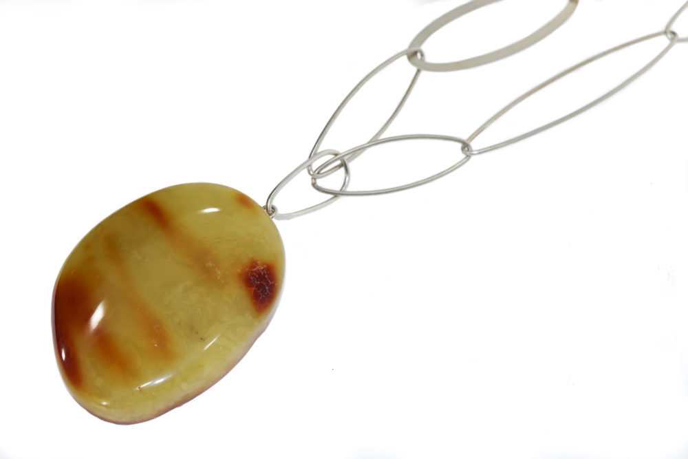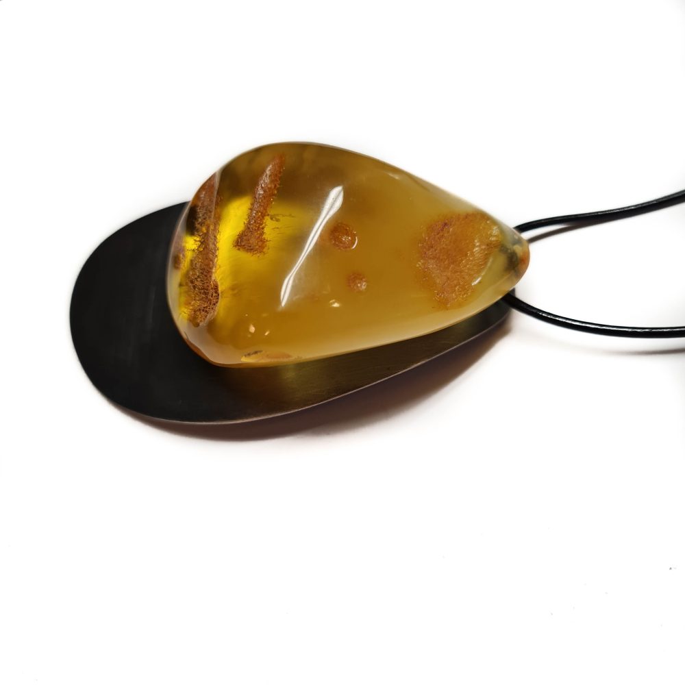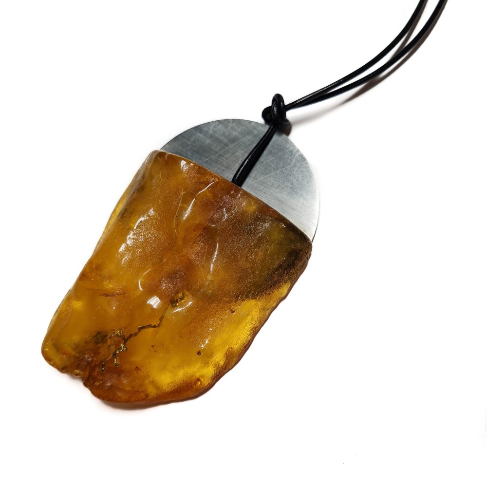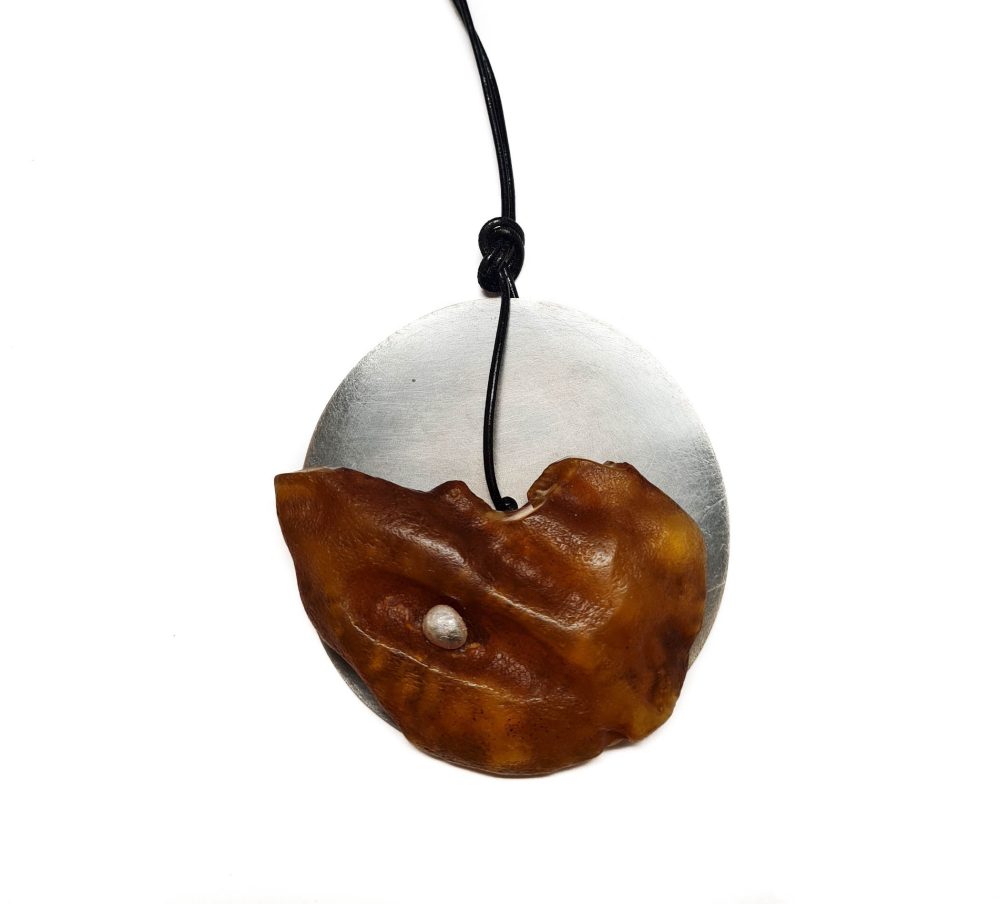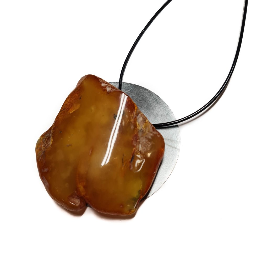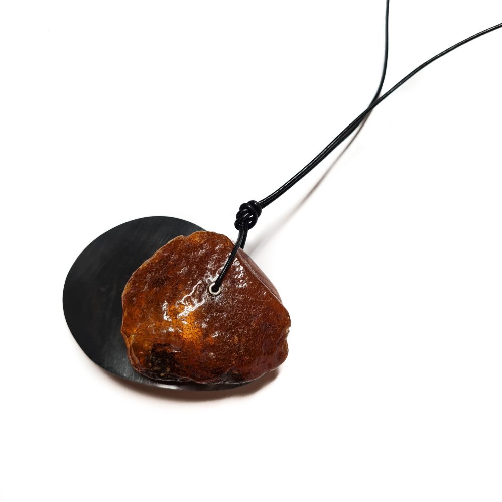 Naturalne, o oryginalnej formie bursztyny umieszczone zostały na srebrnych dyskach i zawieszone na cienkim skórzanym rzemyku lub długim łańcuszku. Prostota z jednej strony, a niepowtarzalny, unikatowy charakter z drugiej, sprawiają, że naszyjnik może pełnić funkcję osobistego amuletu.