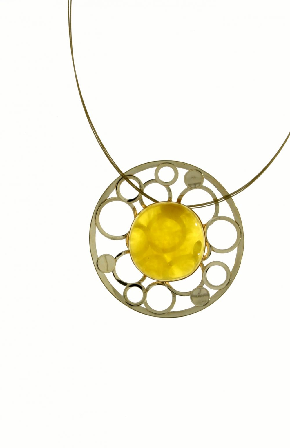 Płaskie kółka, wycięte w środku oraz pełne, łączą się ze sobą, tworząc dekoracyjny motyw i budując kształt wklęsłej czaszy. W centrum znajduje się piękny, prześwitujący jasnożółty bursztyn z delikatną mgiełką, tak, że wzór jest przezeń widoczny. Wisior zawieszony jest na długiej lince stalowej w kolorze złotym.