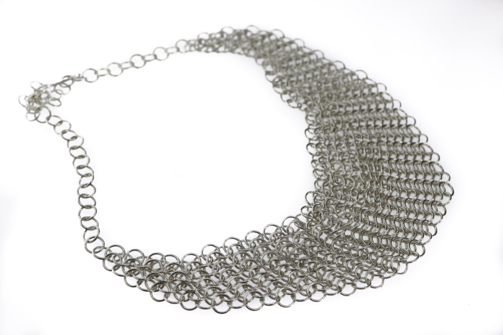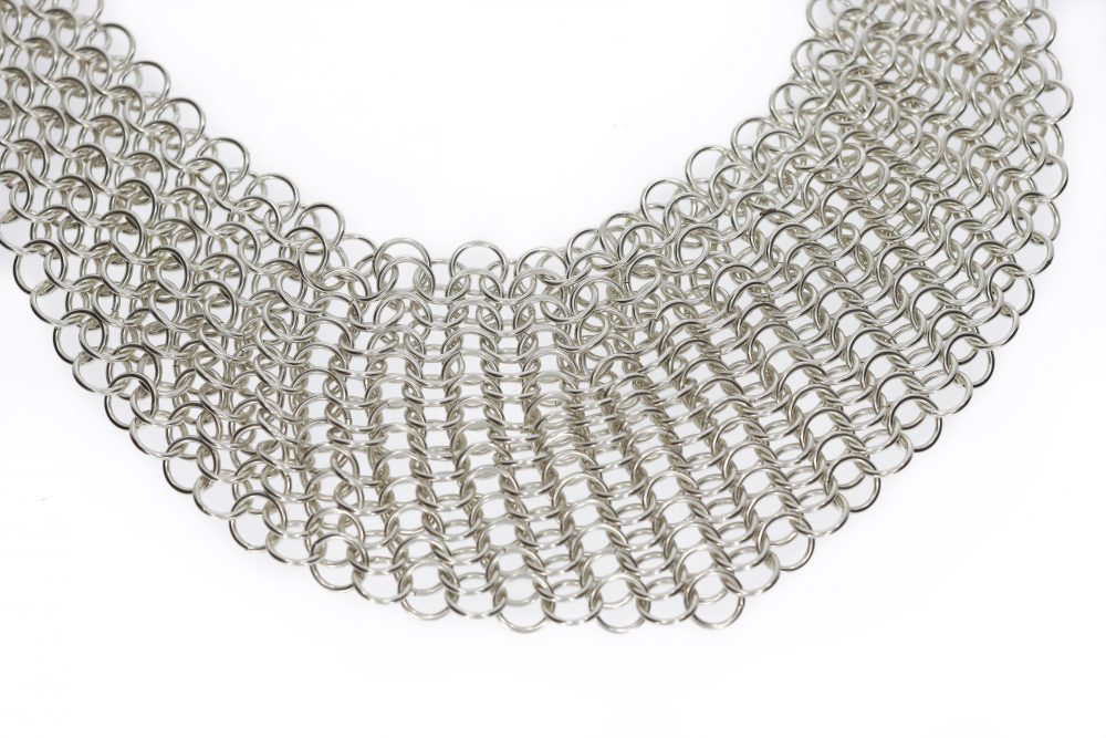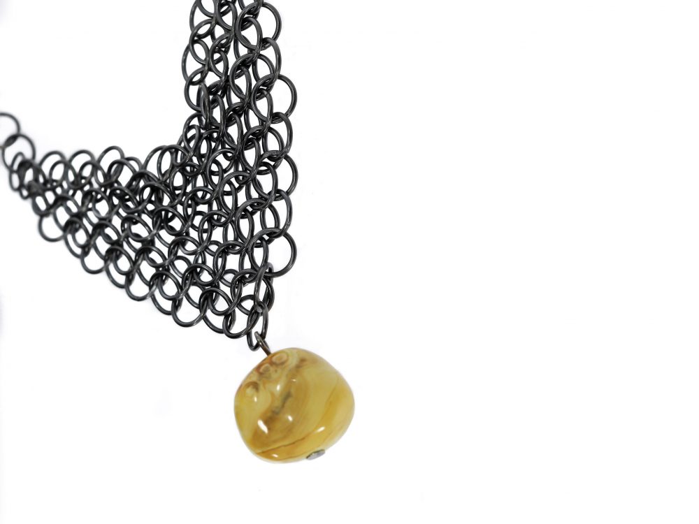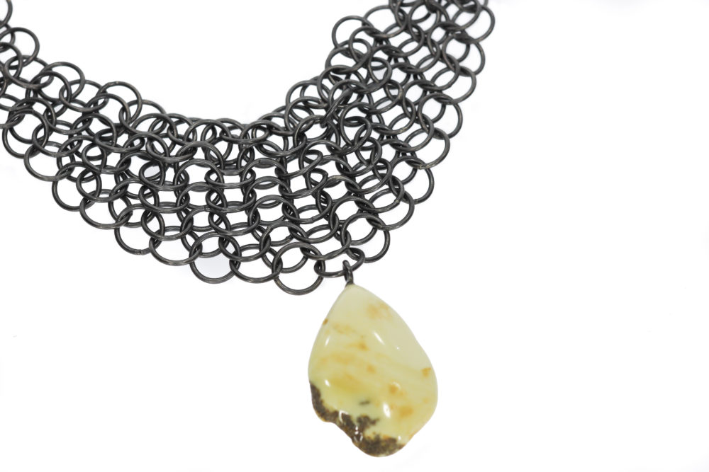 Naszyjniki o splocie zainspirowanym średniowiecznymi kolczugami, składane z kółek o różnej średnicy i w różnym układzie stanowią oryginalne uzupełnienie zawieszonych na nich bursztynów o fantazyjnych barwach i kształtach.