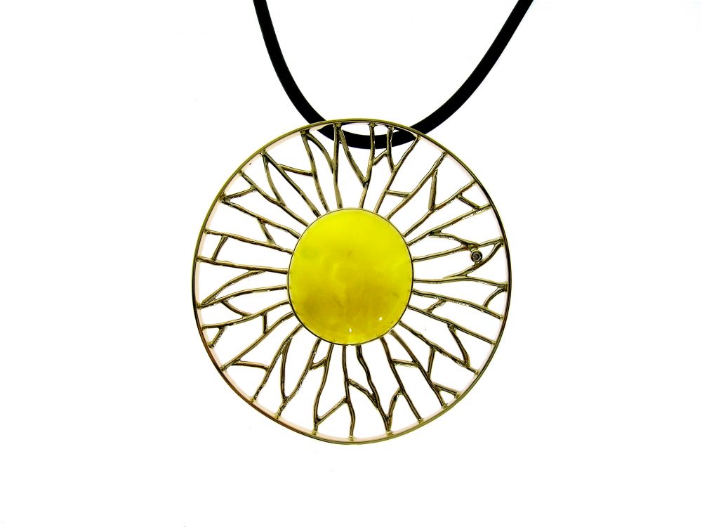 Centralnie umieszczony jasnożółty, półprzejrzysty bursztyn otoczony jest promieniście ułożonym ażurowym motywem o charakterze roślinnym. Ciekawa faktura niby-gałązek kontrastuje z gładką powierzchnią zewnętrznego okręgu – ramki, zaś kontrapunktem dla bursztynu jest niewielki brylant.