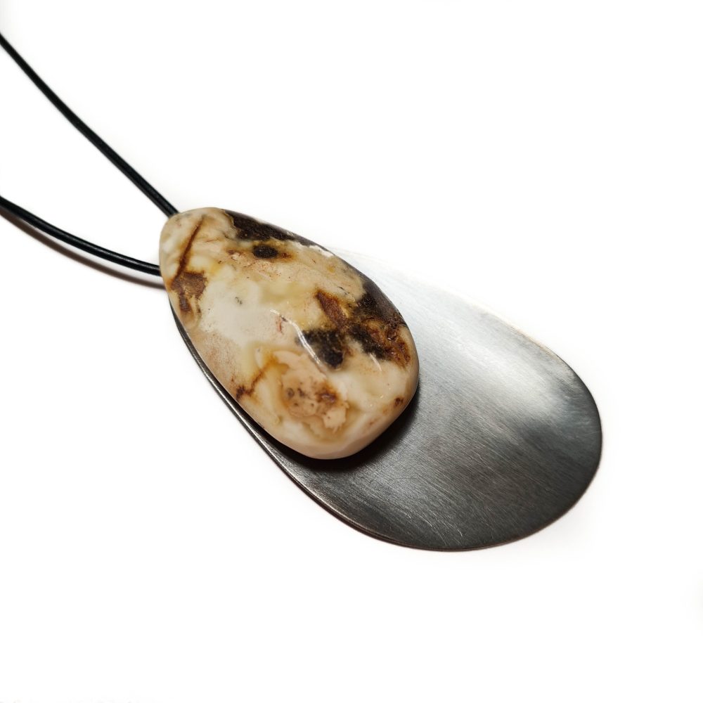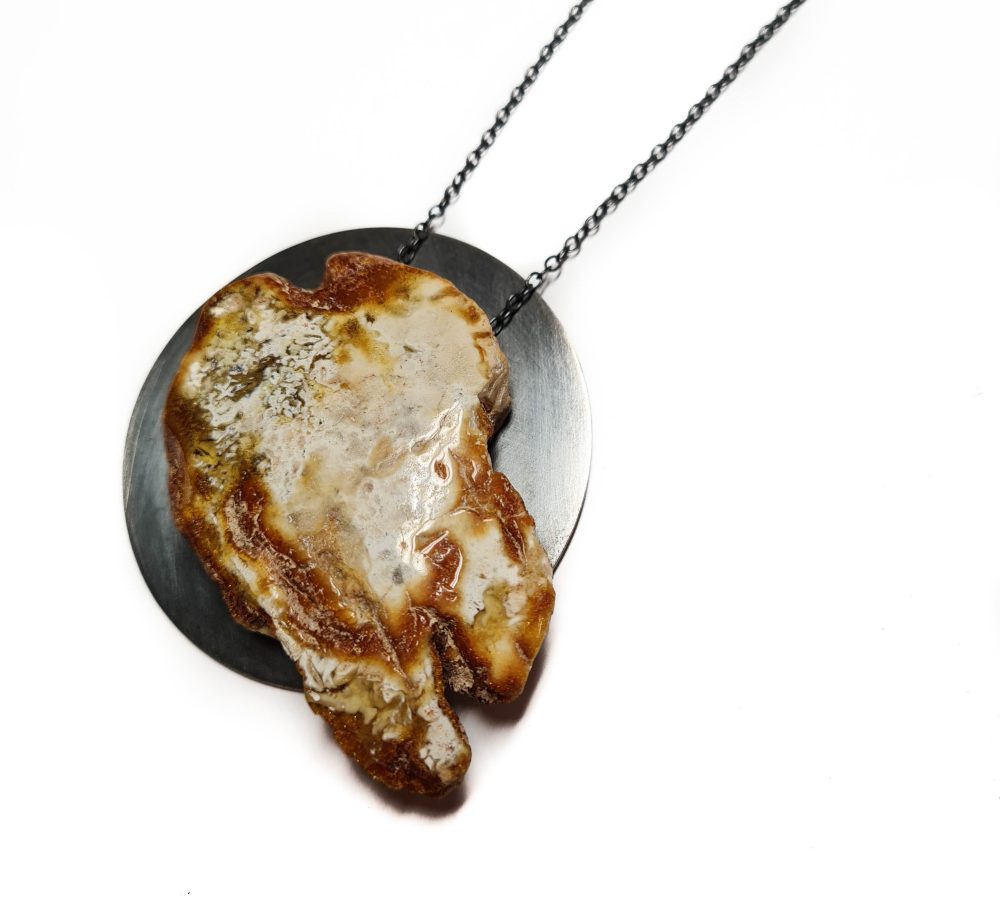 kolekcja naszyjników z matowego srebra, której koncepcja wychodzi od kształtu konkretnej naturalnej bryłki, niezmienionej w szlifie. Do tej unikatowej formy dodane zostało srebro – owalna forma, wygięta i dopasowana do kamienia. Całość staje się nieoczywistym obiektem, zawieszonym – najczęściej asymetrycznie – na cienkim rzemyku lub lince, a noszone zyskuje dynamikę.