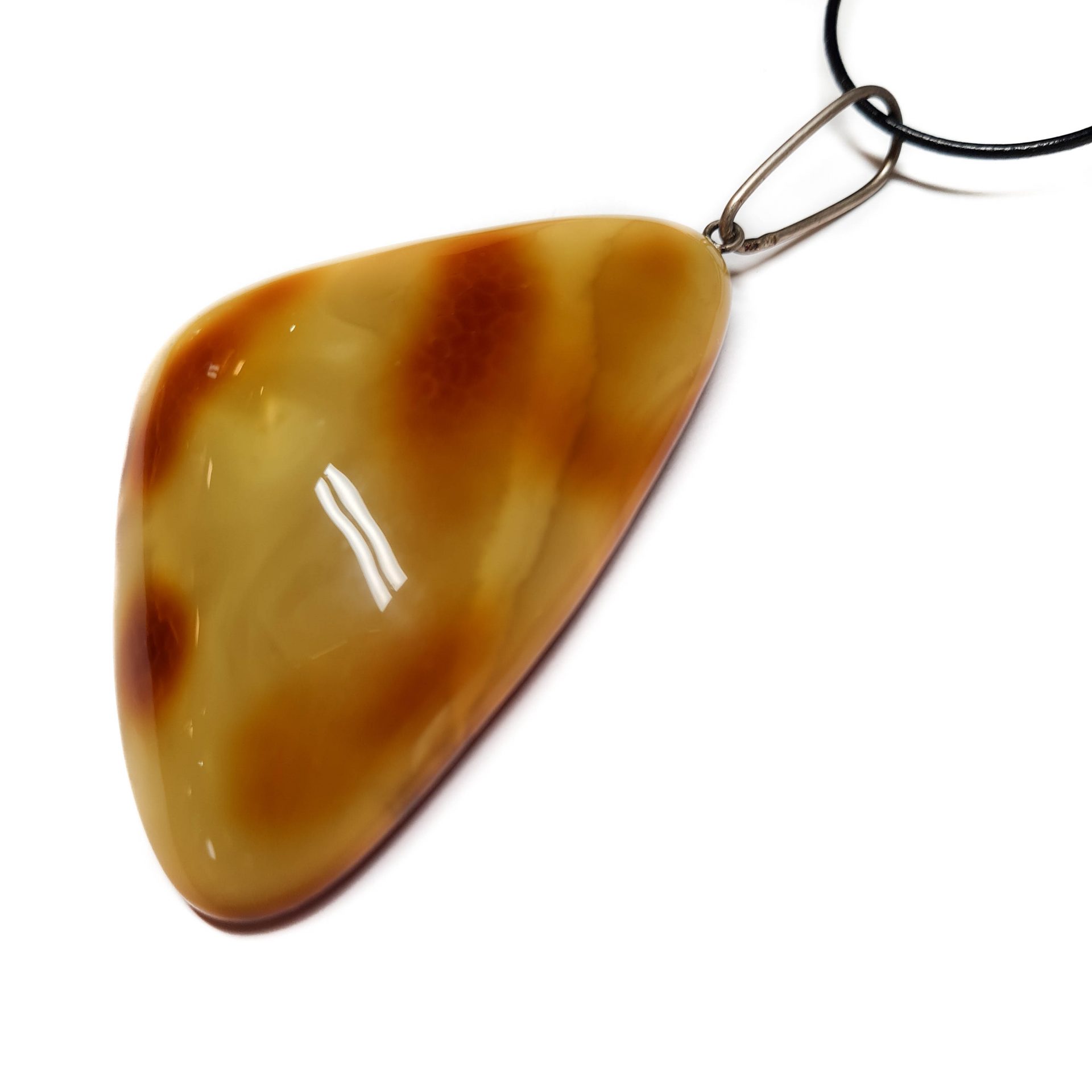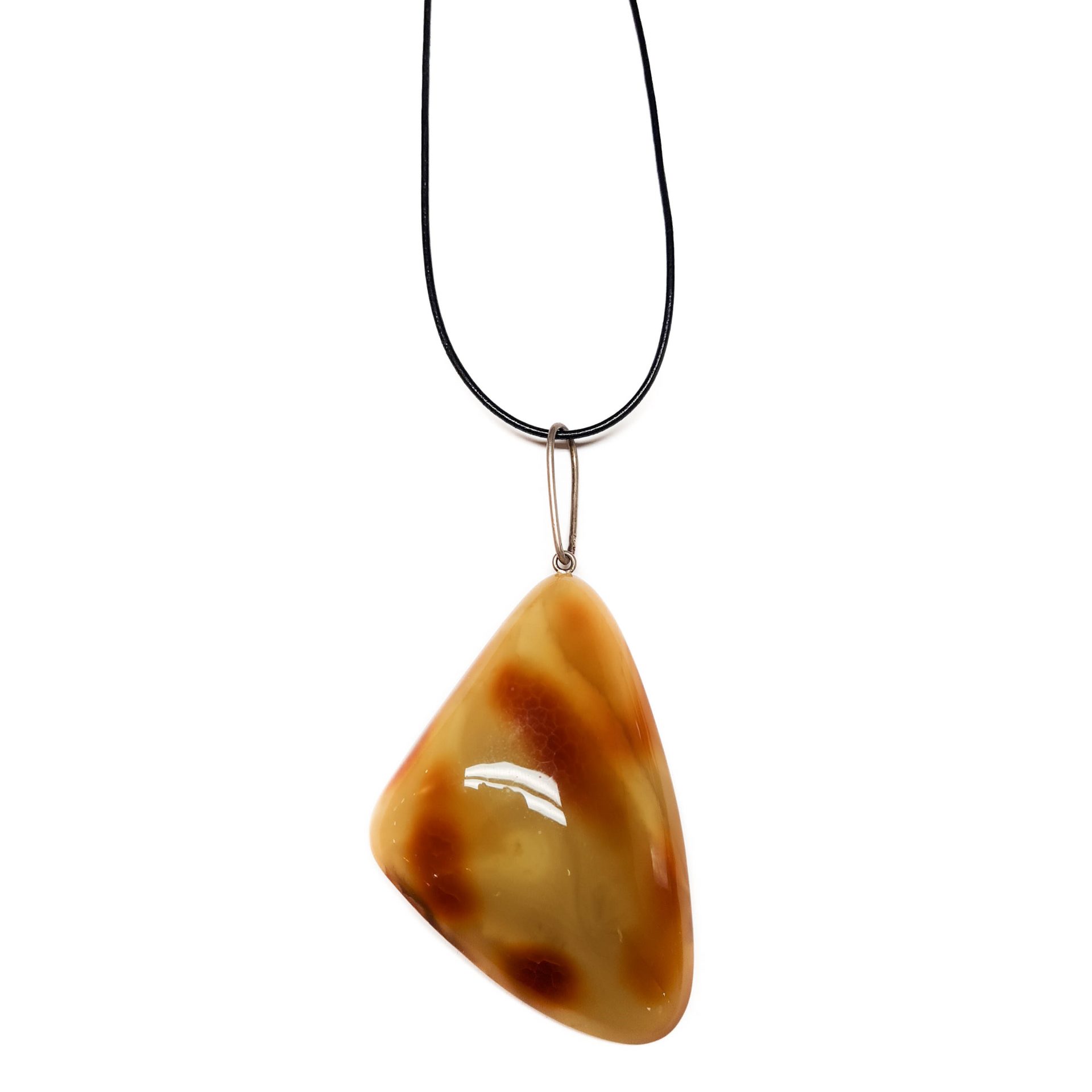 Wisior z pięknego naturalnego bursztynu szlifowanego „z ręki” w kształcie odzwierciedlającym pierwotne proporcje kamienia. Kolor całego bursztynu jest intensywnie żółty w ciepłym tonie, na powierzchni szlifierz pozostawił fragmenty podkorowe, które wybarwiają bursztyn na pomarańczowo. Tył kaboszona pozostał surowy, kolor zachowanej kory bursztynu to ciemnoczerwonobrązowy. Bursztyn zawieszony jest na dużym uszku w kształcie odwróconej łezki ze srebrnego drutu, które umożliwia wykorzystanie do niego rozmaitych łańcuszków, linek lub rzemyków.